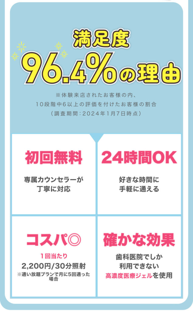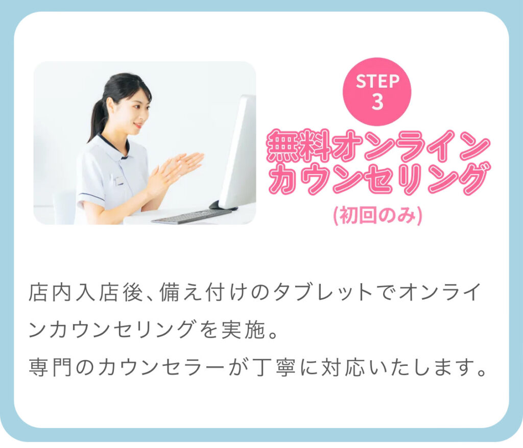 A セルフホワイトニングサロンのためご自身で行っていただきますが、オンラインにてカウンセラーがサポートいたしますのでご安心ください。